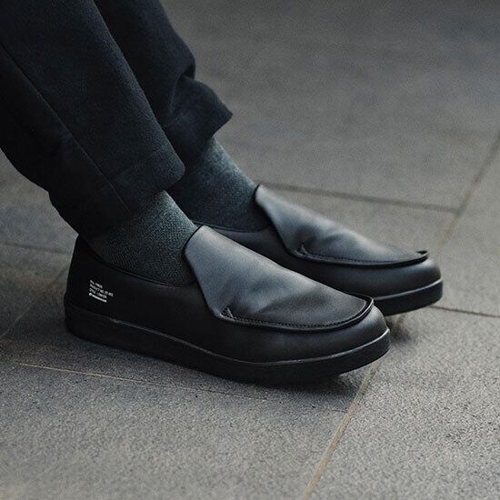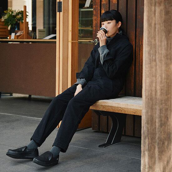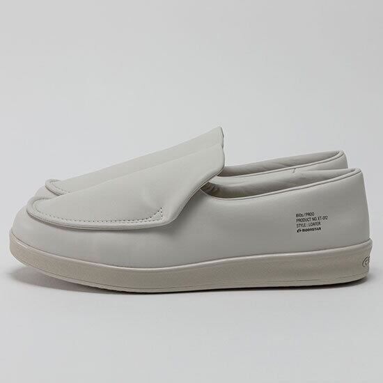 厨房や食品工場で使われるキッチンシューズをデイリーユースに。クリーンな印象でワークスタイルにも適したローファータイプ。油や水に濡れた床面に吸い付くマルチストッパーソールを搭載し、汚れやすい甲部分を丈夫で耐油性に優れた人工皮革でカバー。