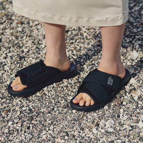ユニバーサルデザインの心地よさをデイリーユースに。スポサンよりも気軽でスライドよりもフィッティングに優れた仕様。フットベッドの素材を高弾性の配合に改良し、コンフォート性を向上。履く人に合わせてベルトを自由に固定できる簡潔な構造のサンダルタイプ。